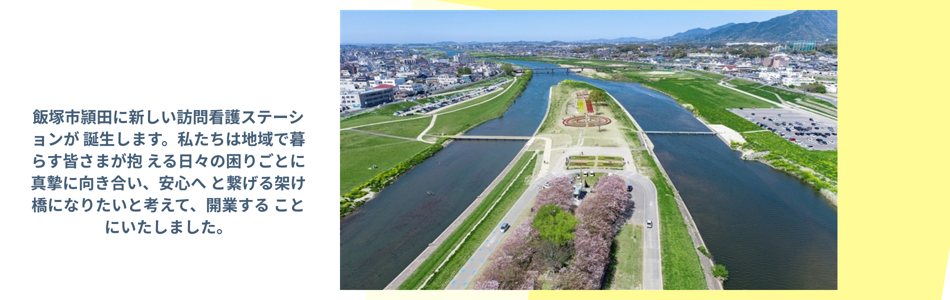 飯塚市頴田に新しい訪問看護ステーションが誕生します。私たちは地域で暮らす皆さまが抱える日々の困りごとに真摯に向き合い、安心へと繋げる架け橋になりたいと考えて、開業することにいたしました。