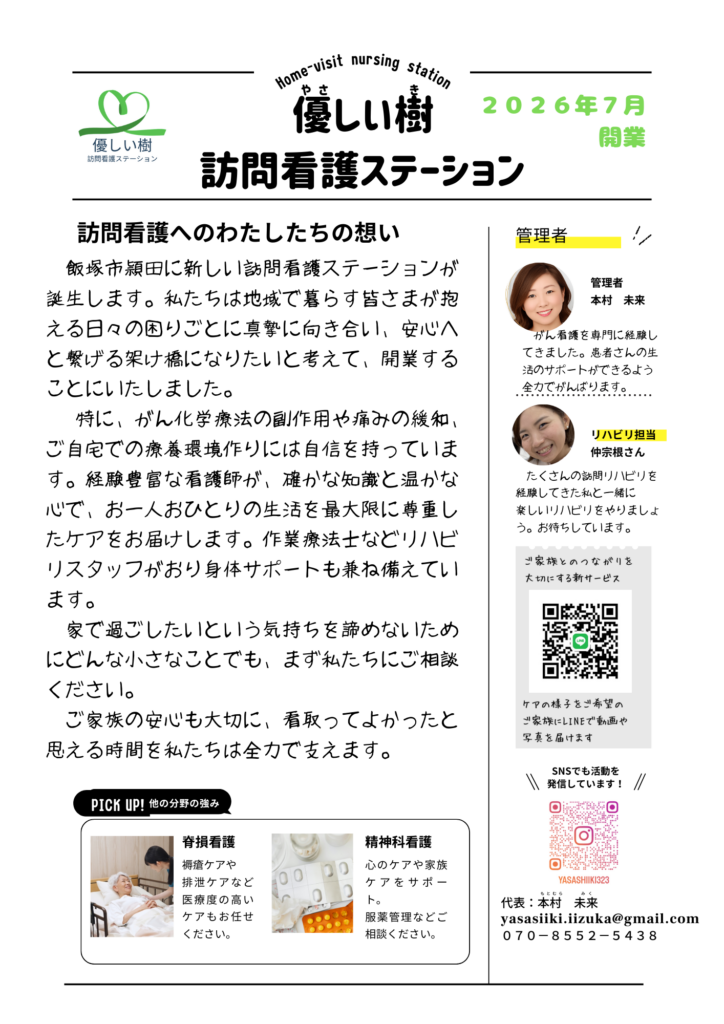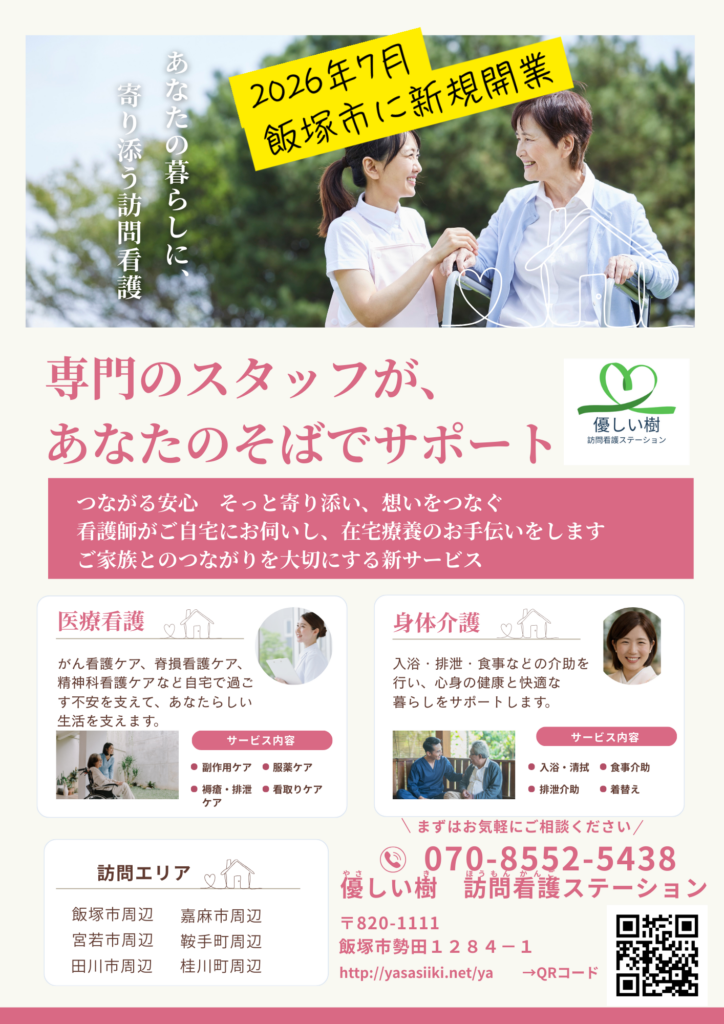 飯塚市頴田に新しい訪問看護ステーションが誕生します。私たちは地域で暮らす皆さまが抱える日々の困りごとに真摯に向き合い、安心へと繋げる架け橋になりたいと考えて、開業することにいたしました。